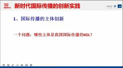 历史回顾结束后,侯迎忠将话题转向目前国际传播的形势与要求。以习近平总书记的重要讲话为参照,侯迎忠展开论述了目前国际传播的任务目标和重点内容,“习近平总书记在‘5.31’重要讲话中提出,讲好中国故事,传播中国声音,展示真实、立体、全面的中国是加强我国国际传播能力建设的重要任务。因此,我们要努力对外展现出中国的各种经验、做法和理念,让世界看到中国最真实的面貌”,加深了听众们对于国际传播的理解。