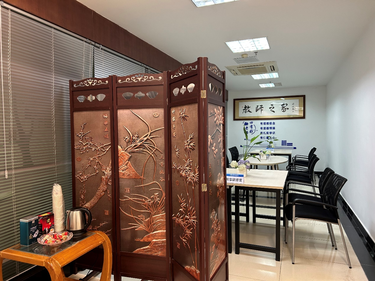 “共享研修室”按“实用”“简约”的原则进行陈设。采用可隔离式入口,为老师们研修准备了电源插座、WIFI接入等条件,还在研修区入口外设置了热水壶及茶叶、咖啡等饮品,并为有需要的老师,准备了白板。