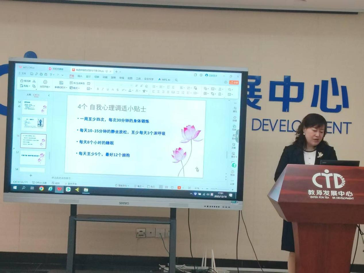 课程围绕识别和应对焦虑与抑郁情绪为主题展开,内容涵盖识别焦虑抑郁的核心表现与科学评估工具、从心理学视角解析情绪问题的成因与发展以及如何应对在关心学生、教学科研的同时,培养自我关怀的能力和习惯三大模块。付桂芳教授以妙趣横生、鞭辟入里的方式,引导教师们科学识别、理性应对焦虑与抑郁情绪,并现场试验缓解焦虑与抑郁情绪的办法。