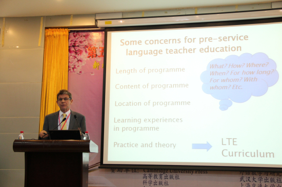 来自华东师范大学的邹为诚教授同样关注教师职前教育,他讲解了华东师范大学英语教学职前教师教育的研究成果。据邹为诚介绍,在2007年中国将教育改革提上日程的背景下所启动的该研究至今已有6年,研究对象系国内英语、英语教育专业的本科毕业生。他指出,研究的指导思想是让接受职前教育的老师带着理论问题在真实课堂中寻找现实表现。因此研究中的培训构建了真实的教学环境,包括同事、专家、监督者、学习团体以及真实学生。他强调,受培训教师必须要critical(具有批判性的),要客观公正地从学术角度看待教学,不能盲目地一味听从经验及教学内容。他强调,这个研究显示,职前英语教师学习提升的内容主要包括:课堂活动安排及操作、教学资源运用、本地教育文化适应、时间掌控、学习规律以及教学语言。