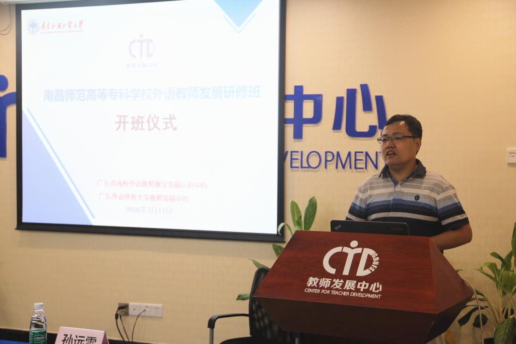 本网讯 7月11日上午9点,由广外教师发展中心主办的南昌师范高等专科学校外语教师发展研修班在教师发展中心多功能会议室举行了简短的开班仪式。广外教师发展中心主任孙远雷、英文学院欧阳护华教授,南昌高等专科师范外语系副主任熊晓春等人出席了仪式并做了讲话。