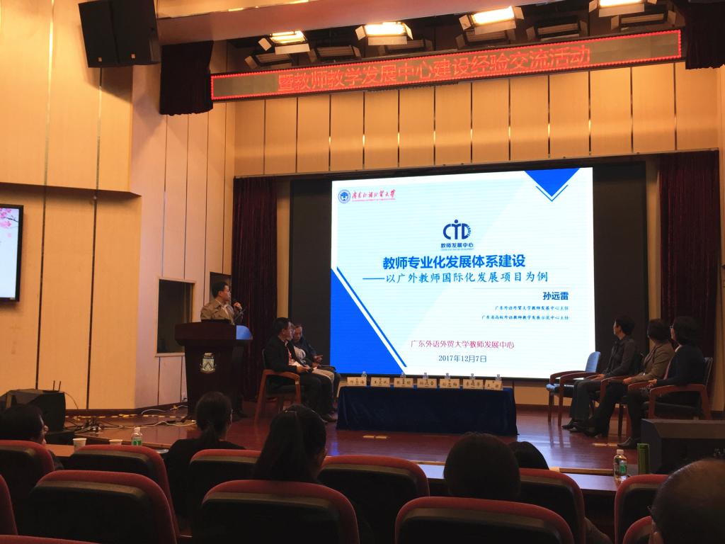 本次全省教师发展中心建设经验交流活动以圆桌会议形式开展,省教育厅高教处副处长邓荣海主持会议,中山大学、华南理工大学、广东外语外贸大学、华南师范大学、深圳大学及广东海洋大学等6所高校的教师发展中心负责人共同分享了各高校教师发展中心建设的成功经验,聚焦存在的问题,深入讨论教师发展中心的未来发展规划思路。孙远雷作为我校代表出席圆桌会议,并做“教师专业化发展体系建设——以广外教师国际化发展项目为例”的主题报告。