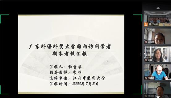 七位青骨项目的访问学者按顺序介绍了他们在广外访学期间科研课题的研究情况、学术交流情况、课程学习情况以及参与的学术活动。今年因为受到疫情的影响,采用了线上访学的方式,他们积极选听了导师的线上课程,参加了各类在线培训等,收获很多。