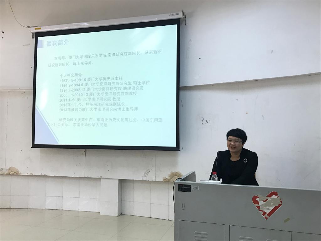 本网讯2016年12月12日下午,由广东外语外贸大学人事处、教师发展中心主办,东方语言文化学院承办的“名师面授”非通用语种教师发展系列讲座第六讲在北校区七教110举行,厦门大学南洋研究院副院长、博士生导师施雪琴教授做了题为《新海丝视野下的东南亚华人及中国-东南亚人文交流》的主题讲座。