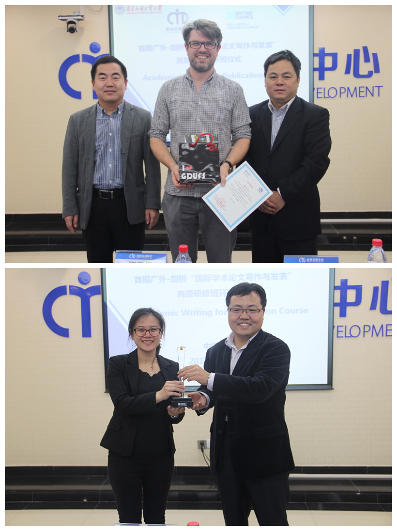阳爱民在致辞中表示,作为一所国际化特色鲜明的大学,教师国际化、科研国际化是我校教育国际化的重要内容。近年来,教师发展中心开发了一系列旨在促进教师专业化成长的研修项目,走在了全省高校前列。此次与科研处联合举办的“广外-剑桥国际学术论文写作与发表研修班”是深化我校科研体制机制改革,促进科研国际化建设、提高教师国际化科研能力的重要举措。对本研修班,阳爱民寄语学员们全情投入,从思路到方法、从语言到技巧、从点到面全方位提高国际论文的写作能力,并希望教师发展中心继续开拓创新,系统化构建教师培养培训体系,形成价值引领、追求卓越的“广外教师发展模式”。开班仪式上,科研处处长陈彦辉、人事处处长谢文新分别为培训师颁发了导师证书及纪念品,王雪莹代表英国领事馆文化教育处与教师发展中心主任孙远雷互赠了合作纪念品。
