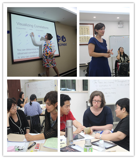 本次研修重在研讨及实操设计教学学术,所有学员须在研修结束时展示各自的教学学术海报,模拟教学学术会议中海报介绍的环节。培训第一天厘清教学学术的基本概念后,导师深入讲解课前要求学员预习的80页教学学术论文集,从教学学术的单组和双组设计开始,详细讲解了不同类型研究问题下,应采取何种研究设计;并指出教学学术研究中数据的来源广泛,大到学生的期中期末作业,小到课堂笔记纸条,思维导图,甚至学生的社交媒体页面也成为数据的可靠来源。在研究方法方面,教学学术融合质性量化研究,可根据研究目的科学采用,也可以量化质性数据,辅之以有效的数据分析工具,可保证研究的信度和效度。