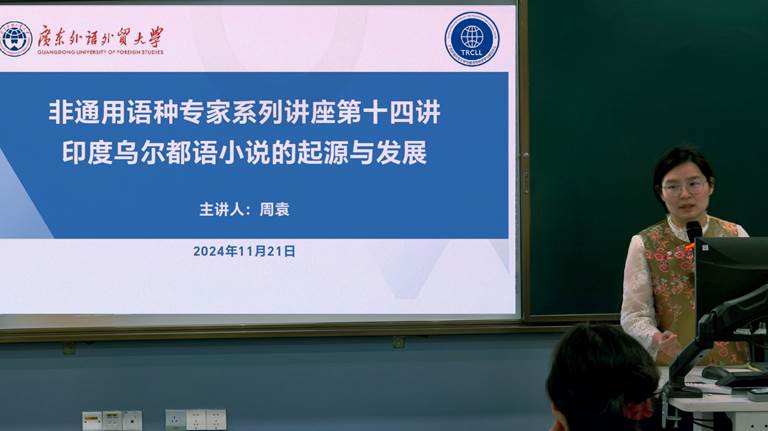 本网讯 2024年11月21日,北京外国语大学亚洲学院乌尔都语讲师周袁应邀为广外师生作主题为“印度乌尔都语小说的起源和发展”的讲座。讲座由广东外语外贸大学人力资源部(教师发展中心)主办,非通用语种教学与研究中心承办。