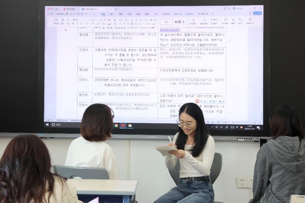 在互动环节,金珍我教授组织现场学生进行场景模拟实践,由三位同学分别扮演医生、患者以及译员,进行实景口译演练。她对同学们的表现予以肯定,并点明口译训练有助于提升记忆力、逻辑思维与表达能力,译员应保持中立,确保信息传递迅速、准确、流畅。