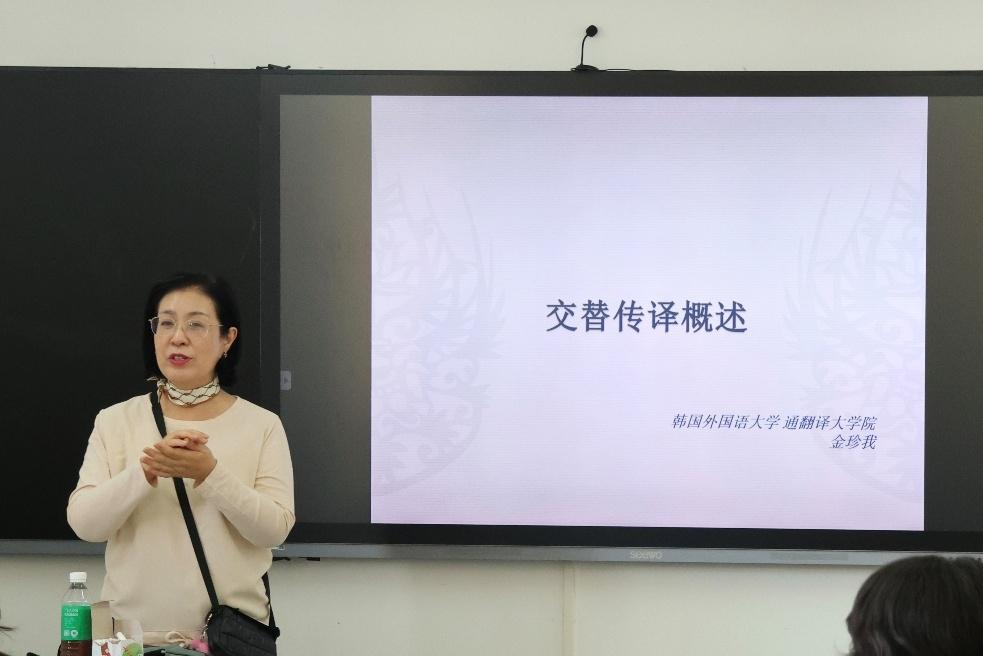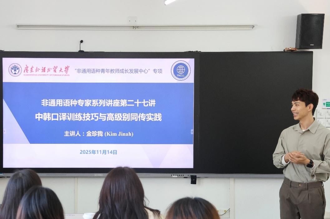 本网讯2025年11月14日下午,由广东外语外贸大学非通用语教学与研究中心、人力资源部(教师发展中心)联合主办,亚非语言文化学院承办的非通用语种专家系列讲座第二十七讲在白云山校区第一教学楼南楼411室顺利举行。本次讲座以“中韩口译训练技巧与高级别同传实践”为主题,特邀韩国外国语大学高级翻译学院、研究生院教授金珍我担任主讲,我校亚非语言文化学院朝鲜语系教师林明主持,朝鲜语系教师代表、MIT学生以及本科生踊跃参与。