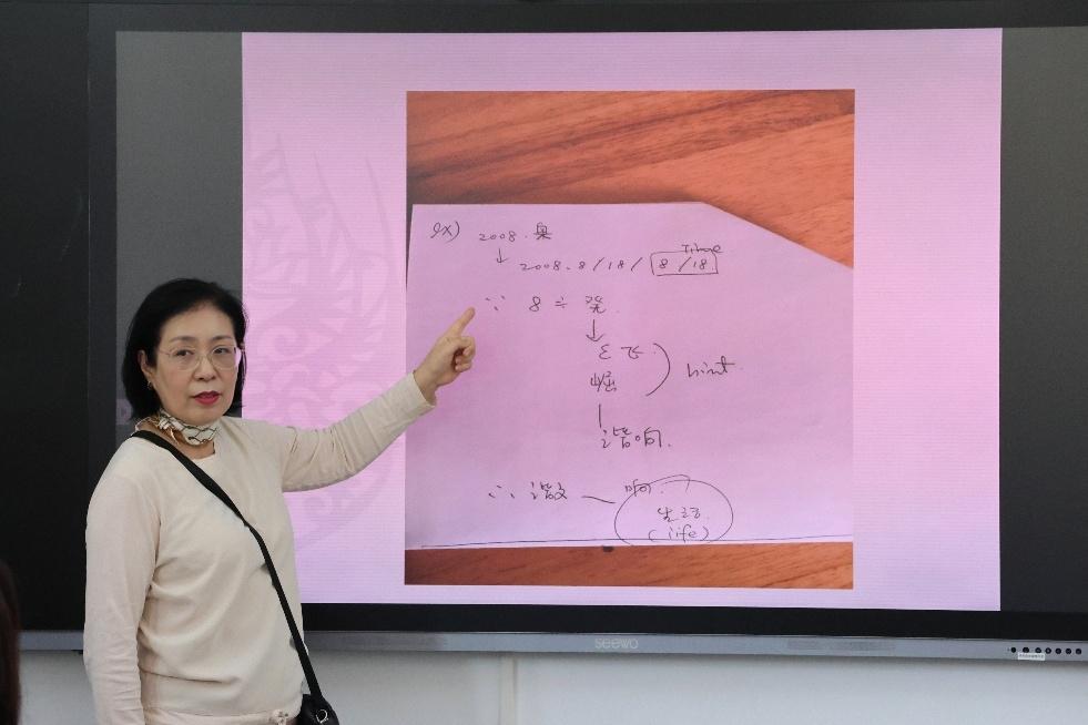 金珍我教授指出,交替传译是国际会议口译的主要方式之一,并以此切入系统解析了中韩口译的核心训练方法。她强调,交替传译需掌握切分法与科学笔记方法,即切割原句的句子成分或语义群并按目标语语法重组,有效处理复杂长句,实现快速准确传译。此外,她亦阐明笔记应在理解与思考的基础上,遵循“6W1H”原则记录关键信息,并可借助图形、缩略语及关系符号构建个人符号系统,提升记录效率。随后,金珍我教授辅以具体案例进行实操演示,帮助师生深化理解。