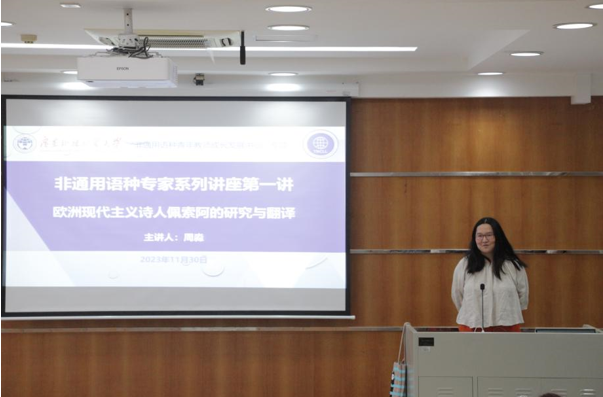 2023年11月30日下午14:00,我校非通用语种专家系列讲座第一讲在白云山校区第九教学楼103教室举行。葡萄牙科英布拉大学客座副教授、科英布拉大学孔子学院外方执行院长、中国社科院-科英布拉大学中国研究中心葡方联席执行主任周淼老师以“欧洲现代主义诗人佩索阿的研究与翻译”为题作专题讲座。本次活动由人力资源部(教师发展中心)和非通用语种教学与研究中心共同主办,西方语言文化学院葡萄牙语系承办。