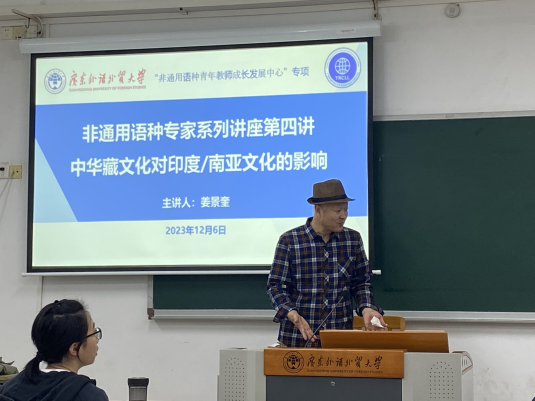 本网讯 2023年12月6日下午16:00,由广东外语外贸大学人力资源部(教师发展中心)与非通用语种教学与研究中心联合主办、广东外语外贸大学亚非语言文化学院承办的非通用语种专家系列讲座第四讲在广外白云山校区第六教学楼B312室顺利举行。本讲座由清华大学外国语言文学系国际与地区研究院教授姜景奎主讲,广外亚非语言文化学院院长助理田克萍主持,讲座主题为“中华藏文化对印度/南亚文化的影响”。