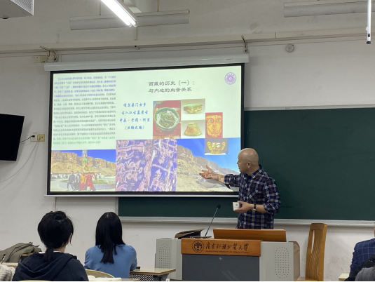 讲座伊始,姜景奎教授以“印度‘改名’风波”作引入,引发了在座师生对婆罗多(Bharat)的地理概念及其文化概念的思考。接下来,姜景奎教授从西藏的历史出发,探讨西藏与内地的血亲关系。姜教授分别从地理、人种、文化等角度进行分析,溯源中华藏文化根脉,进而论证了藏民族文化是中华文明体的自然成分。