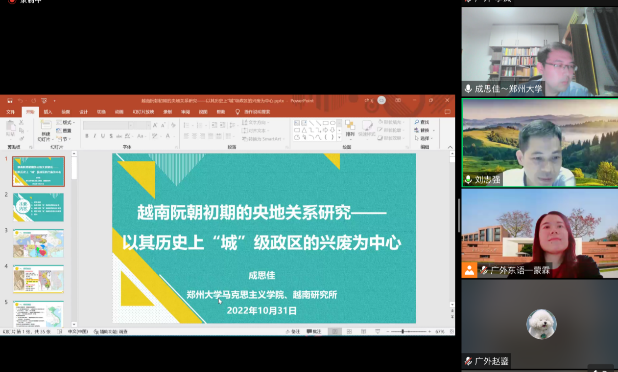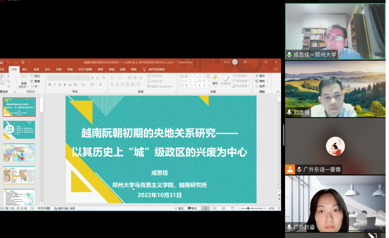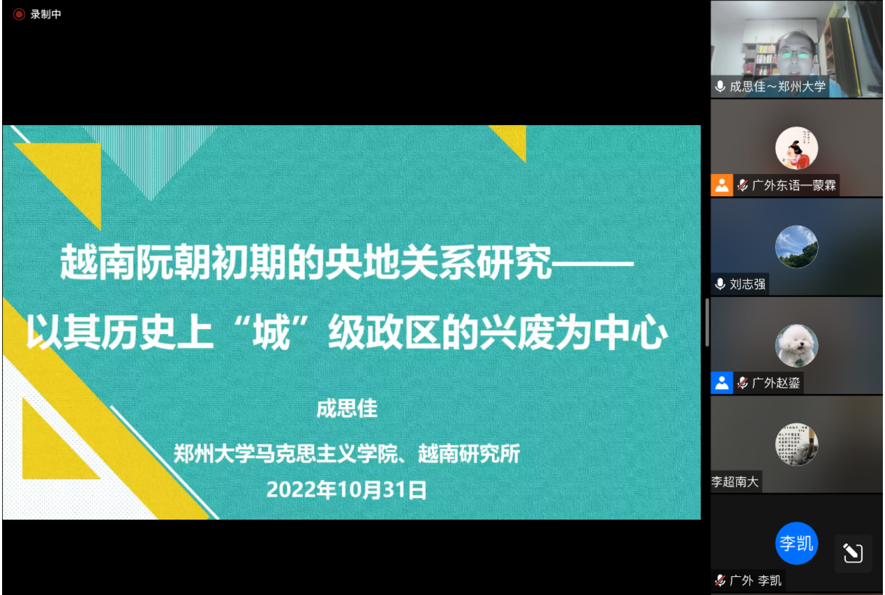 本网讯 2022年10月31日晚,广外教育部国别区域研究中心——中南半岛研究中心邀请郑州大学的成思佳研究员开展了题为《越南阮朝初期的央地关系研究:以其历史上“城” 级政区的兴废为中心》的讲座。本次会议由人事处、教师发展中心主办。
