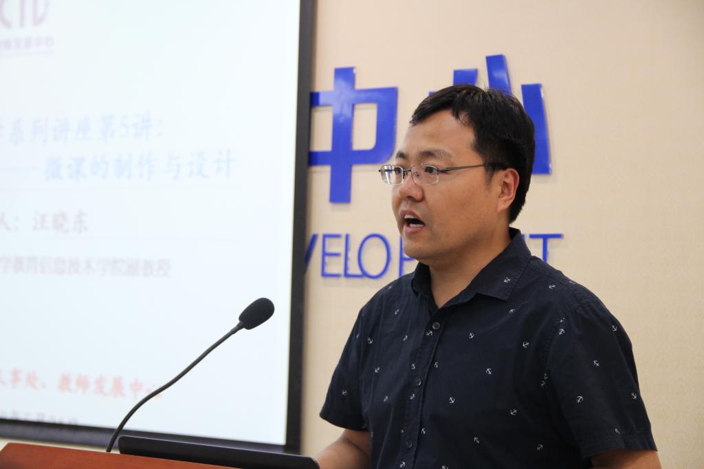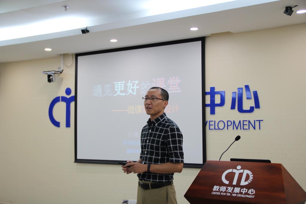 本网讯 为了进一步利用信息化手段提高教学水平,扩大优质教育资源的覆盖融合,实现教育技术与教学资源的深度融合与共享。5月24日下午,教师发展中心邀请到了教育部教育管理信息中心特聘专家、华南师范大学教育信息技术学院的汪晓东博士为我校教师开展信息化教学系列培训第5讲,题为“遇见更好的课堂——微课的制作和设计”。教师发展中心主任孙远雷、科长陈思、第四届微课比赛参赛教师、学生技术助理及感兴趣的老师来到了现场。培训由孙远雷主持。