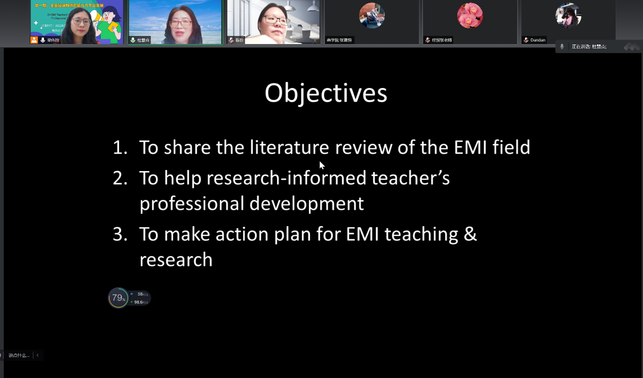 本次沙龙为前期教师发展中心举办的全英授课EMI培训的拓展,目的在于促进全英授课教师内化培训所学,持续反思所学,提高我校全英授课教师对全英教师的认知水平和教学技能。作为内嵌于“全英教师专项提升计划”中的有机组成部分,全英授课教师发展共同体沙龙受到我校教师的广泛关注和欢迎,参与教师纷纷提出持续开展该项活动、促进更多专业发展共同体形成的需求与愿望。
