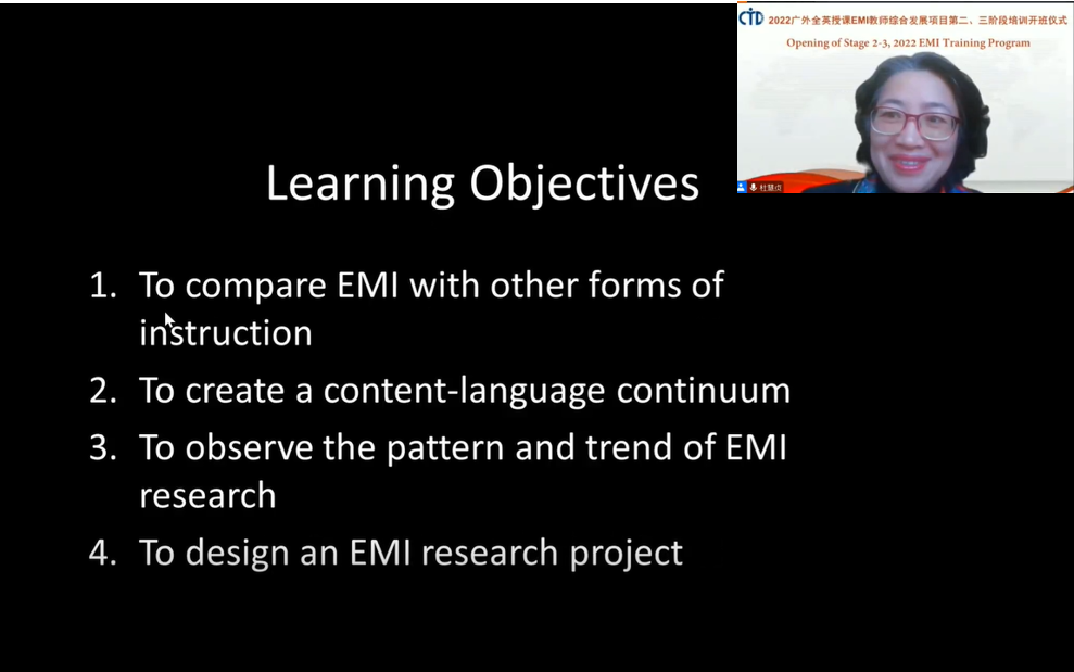 导师杜慧贞则为教师学员们绘制了全英教学EMI地图,厘清了国内围绕全英教学的相关概念,介绍了EMI的最新研究趋势。她强调了实施教研结合的重要性,鼓励参训教师以研促教、以教长研,在开展教学的同时,不断反思与钻研,提升自我。