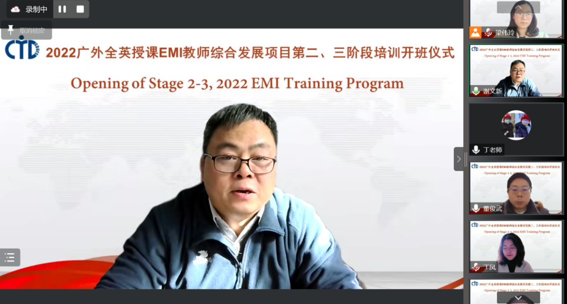 开班仪式上,谢文新代表人力资源部(教师发展中心)对两位导师多年来致力于教师发展培训工作,精心设计本土化特色的全英授课培训表示了衷心的感谢,也对参训教师排除困难,疫情期间坚持线上参与培训表示了敬意。他简要介绍广外EMI项目开展以来所取得的成果,并勉励校内培训师队伍与中心一起,继续精诚投入,打造具有品牌效应的广外全英授课教师培训项目,寄语学员全情投入,学有所成,训有所获,将培训所得入脑、入心、入课堂。随后,董俊武教授就培训的注意事项及相关要求进行了补充说明。