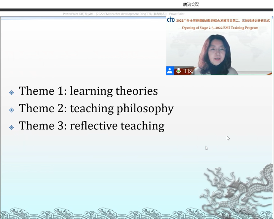 导师丁凤围绕“学习理论”、“教学哲学”、“反思性教学”三个主题进行培训。她首先介绍了“建构主义”(constructivism)学习观,讲解了相应的教学策略,鼓励参训教师学会激发学习者的自主学习以及团体学习动力。此外,丁凤还强调了“反思性教学”的重要性,她鼓励参训教师从教材内容的反思出发,多渠道丰富教学内容,以此激发学生的学习热情,指出教师要在每节课后总结教学经验,结合学生反馈,不断优化教学活动和形式。