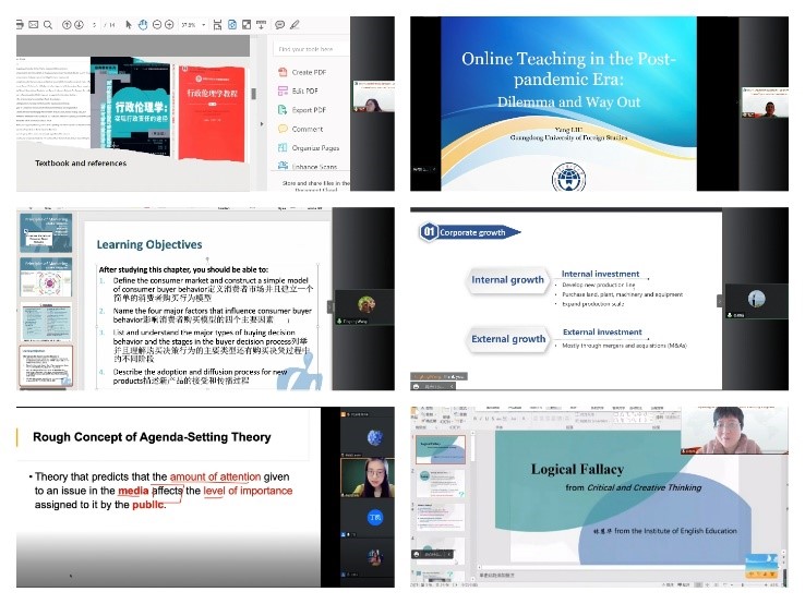 本次培训是我校第三次启用教师发展中心培育的校内导师团队开展授课。担任主讲的杜慧贞、丁凤两位老师是我校自身的全英课程授课教师、和交际英语教学法资深导师。因条件所限,本年度第二、第三阶段的培训无法按以往线下的互动研讨形式进行,改为云端研讨。挑战虽大,两位导师经过充分的准备与精心设计,云端课程的互动精彩依旧。结合对学员们第一、第二阶段培训的观察与总结,两位导师聚焦全英教学的教学理论、教学设计、教学效果、教学学术研究、全英教师专业发展等方面,凝练进阶培训的内容,以线上分组、快速会议、微信小组、微格展示等形式充分激发学员的互动参与,与学员们展开研讨。