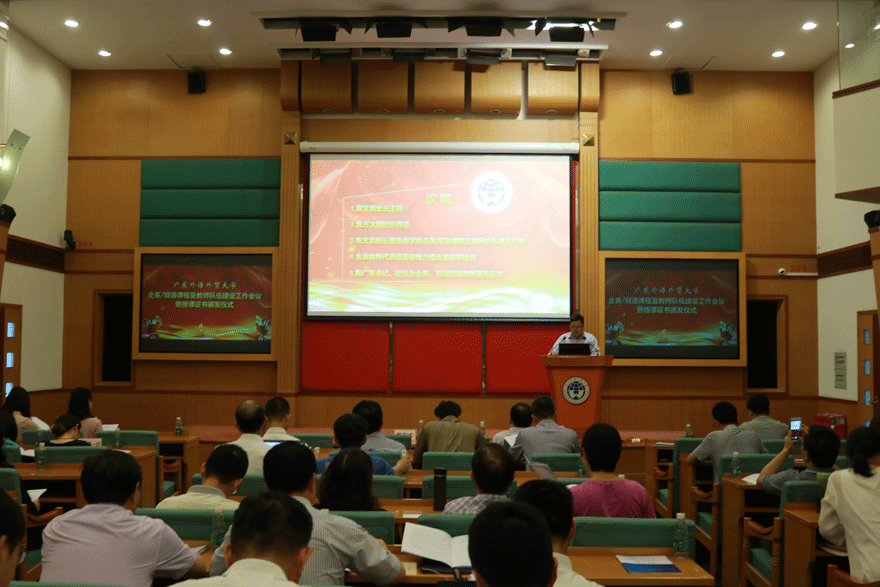 本网讯 5月31日下午,我校全英/双语课程及教师队伍建设工作会议暨授课证书颁发仪式在我校北校区行政楼举行,81名教师和128门课程通过认定,成为我校首批通过学校认证的全英、双语授课教师和课程。校党委书记、校长隋广军,副校长焦方太,人事处、教师发展中心及各职能部处和相关学院的领导、教师代表等出席了会议。
