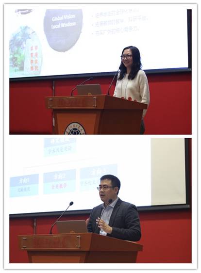 出席会议的代表还聚焦全英双语课程的“教与学”展开了研讨。青年云山学者雷军做了全英教学的挑战与机遇专题讲座。他简要回顾了全英教学的发展历程和研究现状,从政府政策、高校管理者、授课教师以及学生的角度,梳理出全英双语课程建设中的挑战和机遇,从宏观层面探讨了全英双语课程建设的时代必要性,指出了广外在全英双语课程建设的巨大优势,应满怀信心,加强建设。商英学院全英教师代表郝佳则针对全英教学中的本土化问题,以营销类课程为例,探讨如何在全英教学中尽大可能帮助学生建立全球视野和本土智慧。指出教师要从教学理念、教学方法、教材使用和案列开发等多个方面进行本土化的探索与实践,将全英教学与本土智慧有机结合,凸显广外全英教学的优势地位。