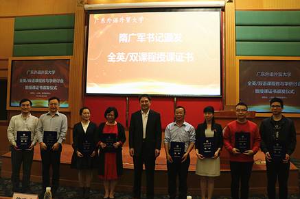 为实现我校建设国际化特色鲜明的高水平大学这一目标,强化学校跨学科复合型人才培养特色,近年来人事处、教务处在国际化师资队伍建设、国际化教学建设等方面做出了大量努力。自2017年7月,教务处、人事处、教师发展中心联合出台了《本科教学全英/双语课程建设管理办法》,在广东省属高校率先推出全英/双语课程及授课教师认定和管理制度,目前已完成三个学期全英/双语课程及授课教师的认定工作,共有161门课,101名教师通过认证。